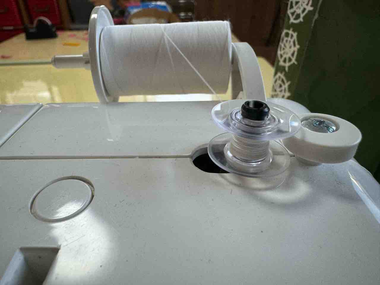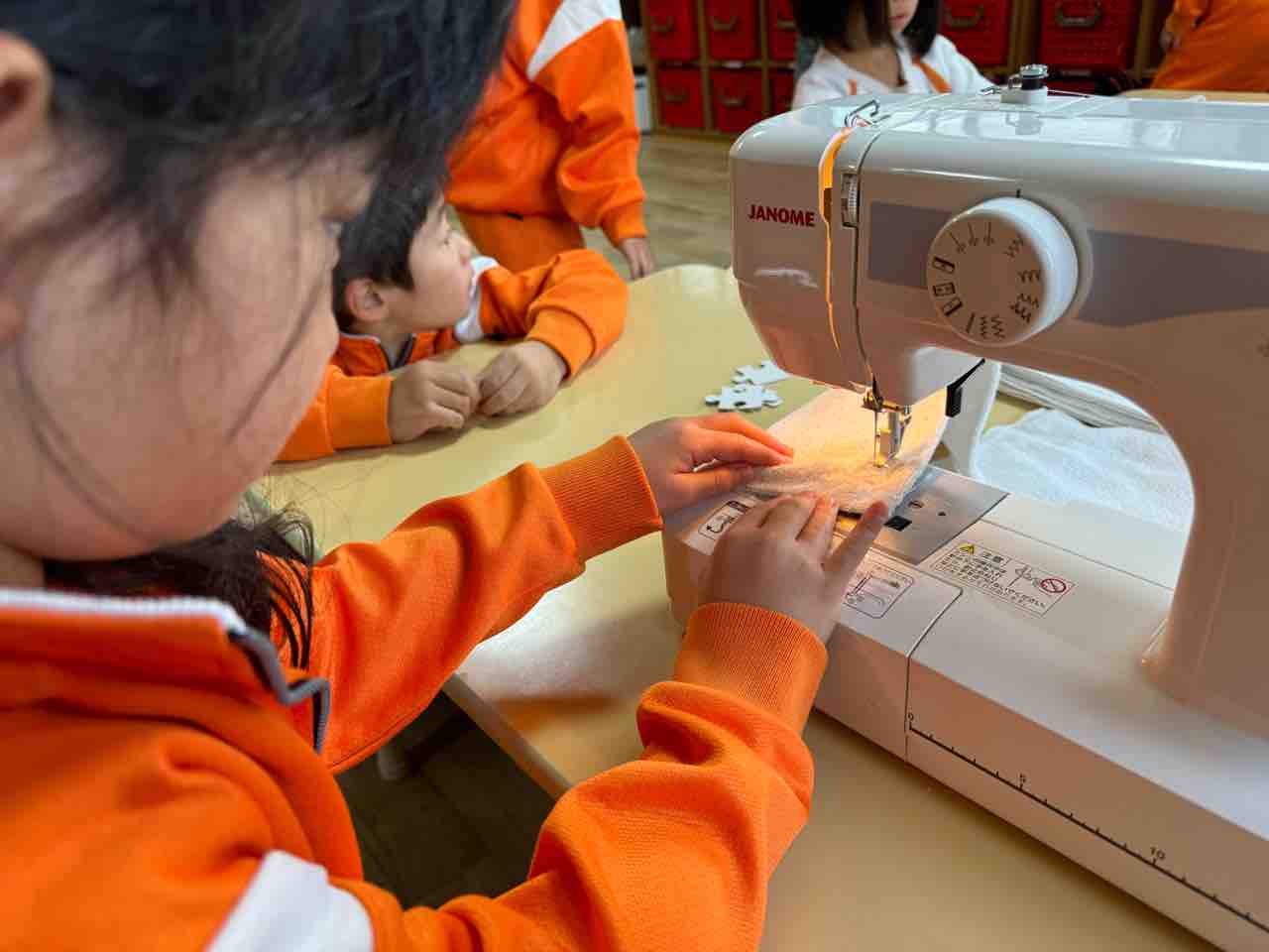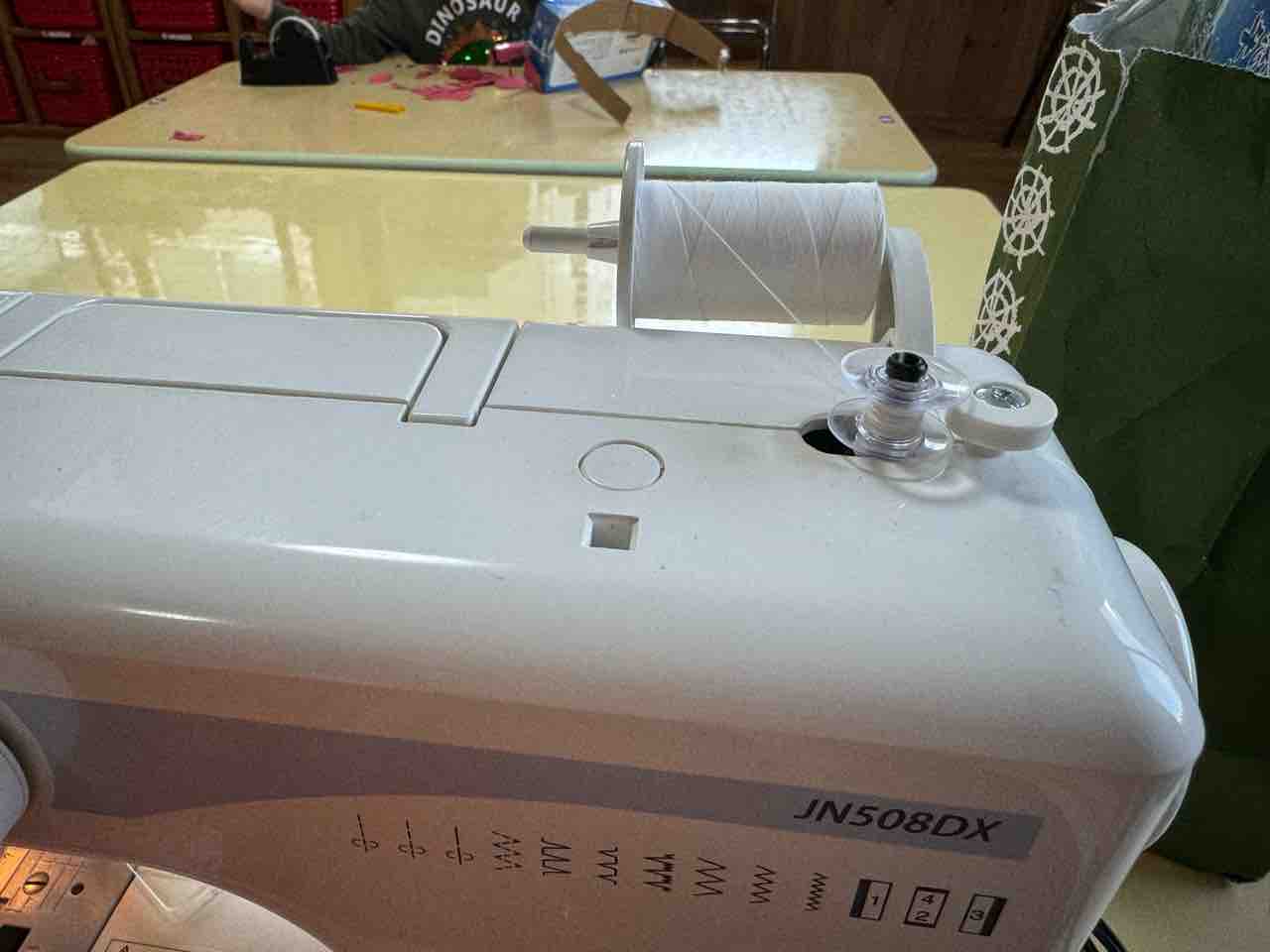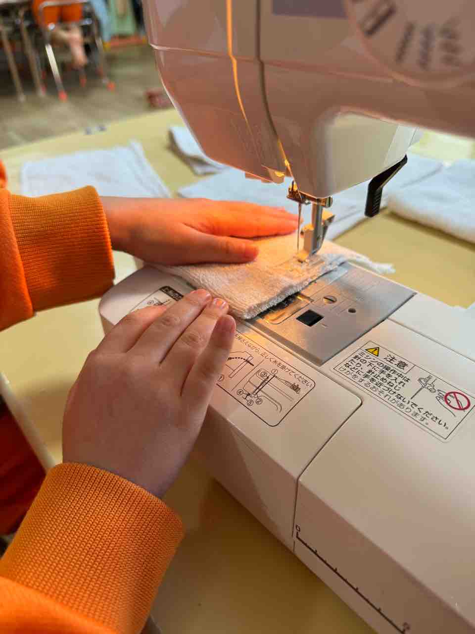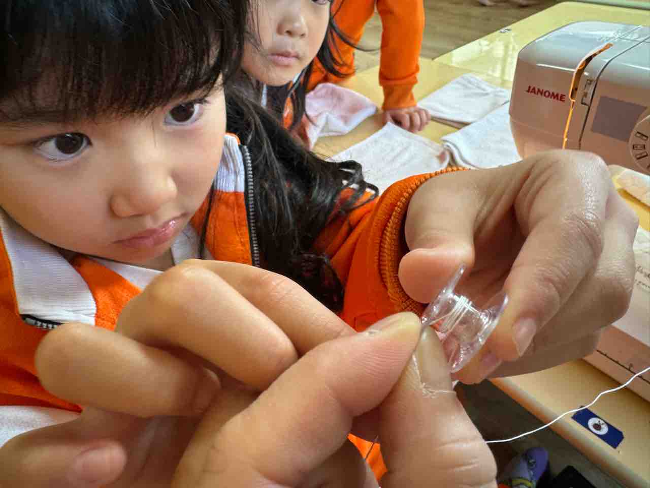 ミシンの糸の掛け方、ボビンの糸巻き、下糸の通し方など、説明を熱心に聞いていました😊