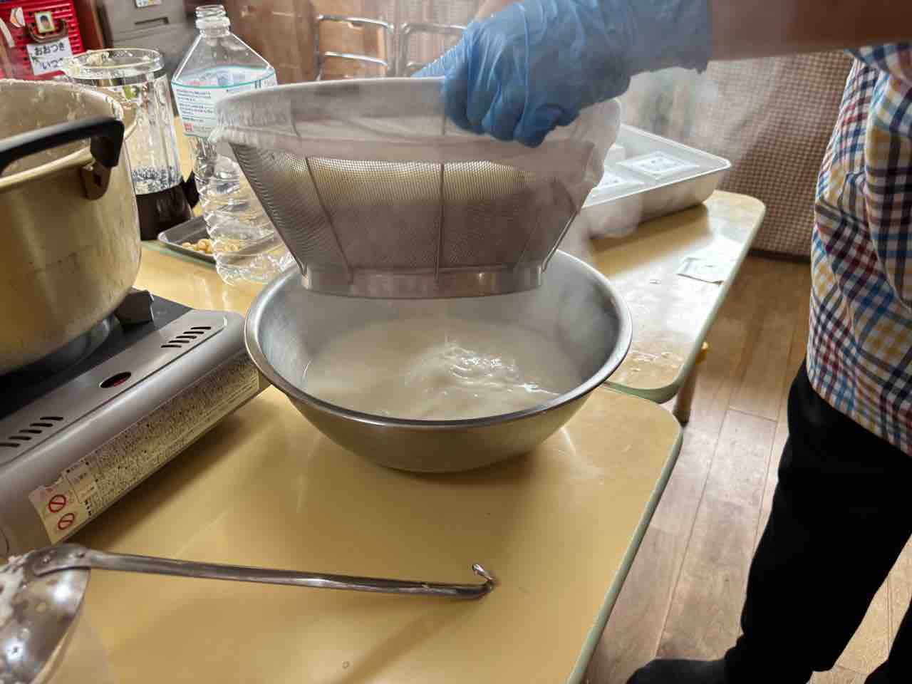 沸騰した豆乳を今度は布でこします!